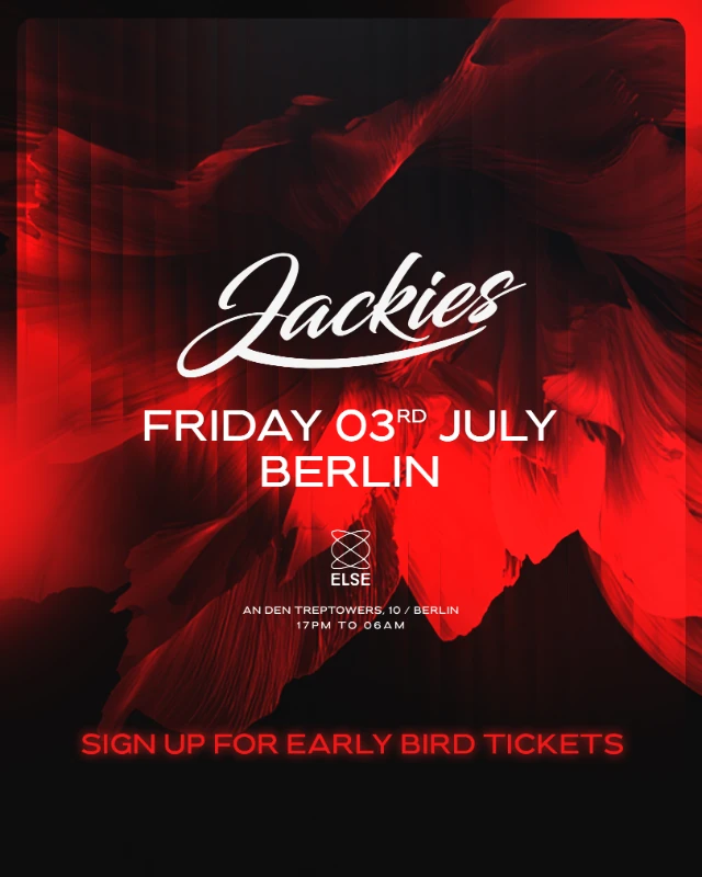 Jackies crosses borders and lands in Berlin for the very first time. The renowned Barcelona-based brand, founded in 2017 and dedicated to the finest House music, will celebrate its debut event in the German capital on Friday, July 3rd, from 17:00 to 22:00. The event will take place at ELSE, one of the city’s most unique open-air venues — a club surrounded by nature and thoughtfully designed down to the last detail, providing the perfect setting for an unforgettable afternoon. With a carefully curated selection of international artists, Jackies will bring its essence, energy, and unmistakable commitment to the best House sound to Berlin, inviting everyone to dance outdoors in a truly special atmosphere. - - - - - - - - - - - - - - - - - - - - - - Jackies cruza fronteras y aterriza por primera vez en BerlĂn. La reconocida marca barcelonesa, fundada en 2017 y dedicada a la mejor mĂşsica House, celebra su primer evento en la capital alemana el prĂłximo viernes 3 de julio, en horario de 17:00 a 22:00. La cita tendrá lugar en ELSE, uno de los espacios Open Air más especiales de la ciudad, un club rodeado de naturaleza y con un entorno cuidado al detalle que ofrece el escenario perfecto para disfrutar de una tarde inolvidable. Con una cuidada selecciĂłn de artistas internacionales, Jackies llevará a BerlĂn su esencia, su energĂa y su inconfundible apuesta por el mejor sonido House, invitando a todos los asistentes a bailar al aire libre en un ambiente Ăşnico. BerlĂn, prepárate: comienza una nueva historia.