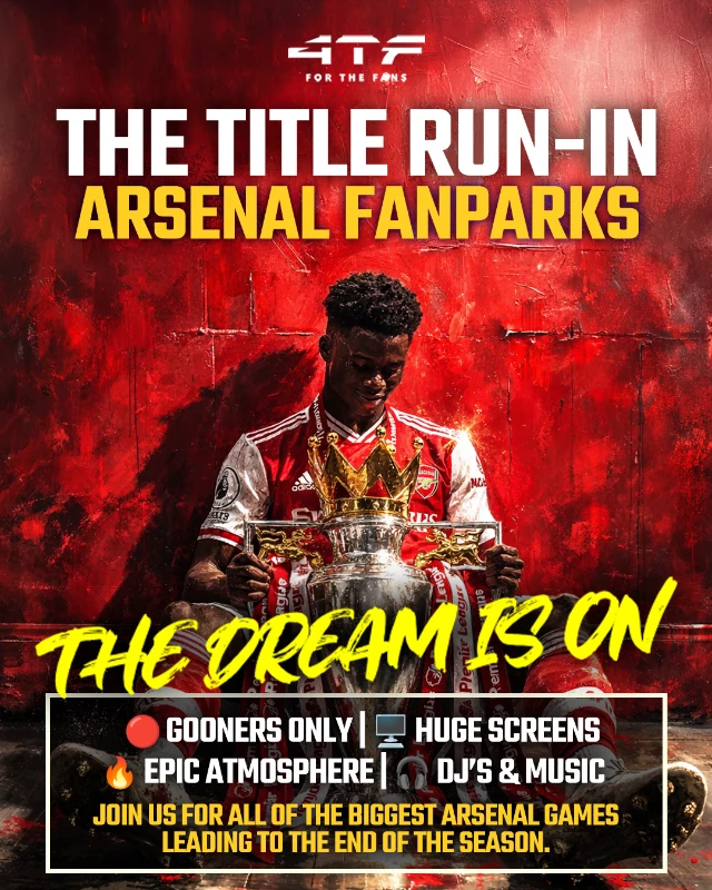 š„ THE DREAM IS ON Join thousands of Gunners for the ultimate match-day experience as we bring you Arsenalās biggest games in the Premier League title run-in, starting with the huge clash against Manchester City on Sunday 19th April. Watch every key moment unfold on the biggest screen in Glasgow, surrounded by thousands of fans as Arsenal push towards the 2025/26 Premier League title. šļø Expect giant HD screens, stadium-level sound, DJs before and after the match, fully stocked bars and an unmatched atmosphere as fans come together for the final stretch of the season. ā½ļø Whether you're backing the Gunners every week or just want to experience the biggest games of the run-in, this is the only place to watch it. š„ FanPark specialists 4TheFans are back again, bringing the energy, production and atmosphere that has already brought together hundreds of thousands of fans across the UK. šØ Thousands have already registered - you donāt want to miss this. šļø Sign up below for 20% off Earlybird tickets.